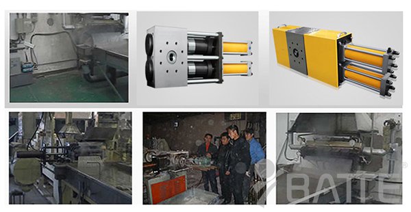 (2)小型的拉條冷切造粒工藝一般都用多網(wǎng)往復(fù)過濾的換網(wǎng)器(如:可采用雙柱四工位液壓換網(wǎng)器、雙柱四工位反沖洗液壓換網(wǎng)器),因?yàn)樗鼛Х€(wěn)壓及自動(dòng)排氣機(jī)構(gòu),換網(wǎng)時(shí)不停機(jī)、不斷條、不影響正常生產(chǎn),粒子光滑無氣泡。口模與換網(wǎng)器一體化設(shè)計(jì)制造,合理、經(jīng)濟(jì)、實(shí)惠!